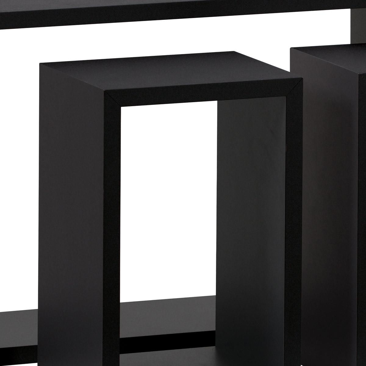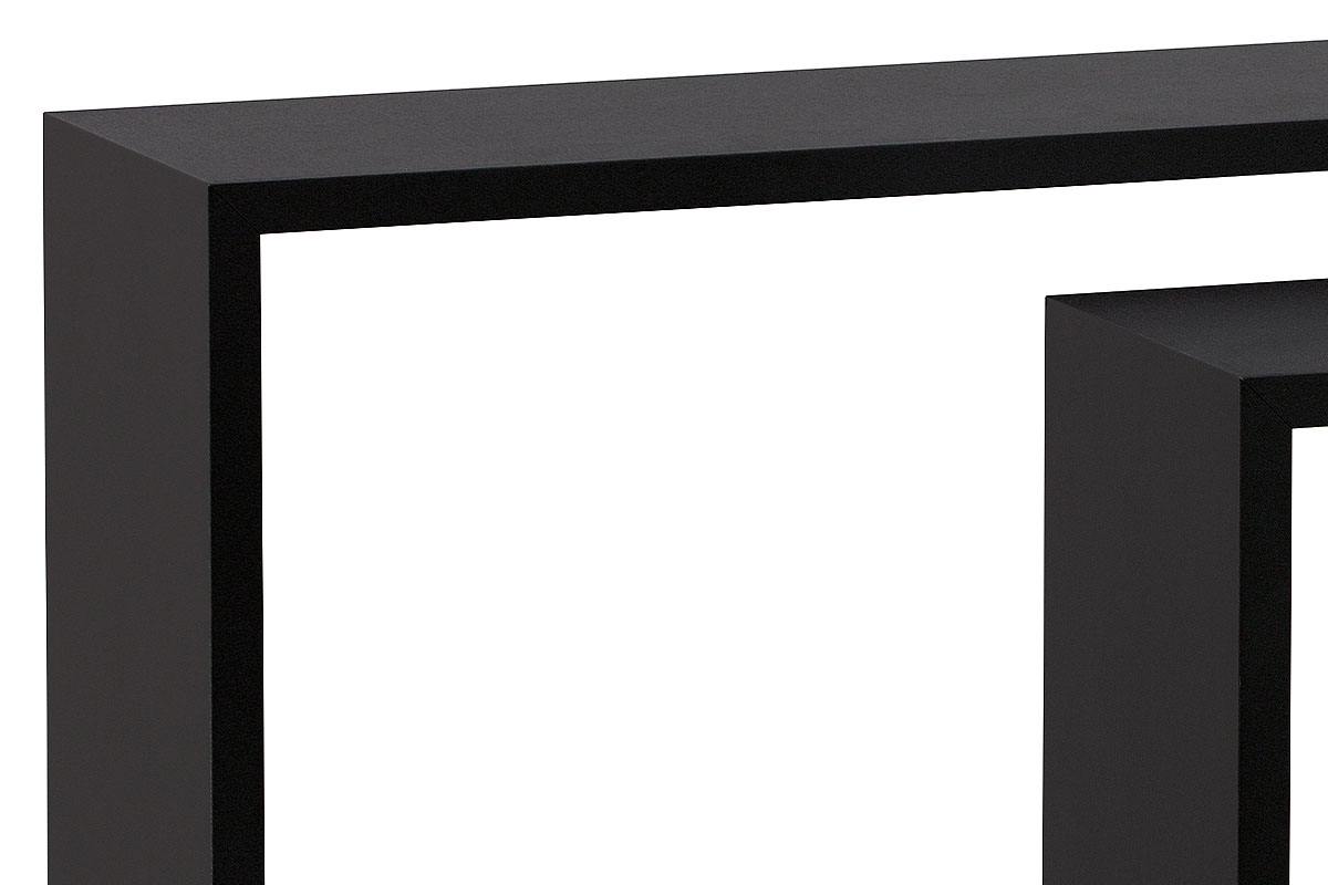 Sada moderných nástenných poličiek vo farbe matná čierna. Sada obsahuje 3ks poličiek rôznych velkosti. Súčasti balením ŠÚ zrubov a hmoždinky pre uchytenie poličiek do steny. Nosnosť poličky je od 5 kg do 15 kg podľa muriva. Poličky ŠÚ vyrobené z laminovaných drevotrieskových dosiek hrúbky 2 cm.