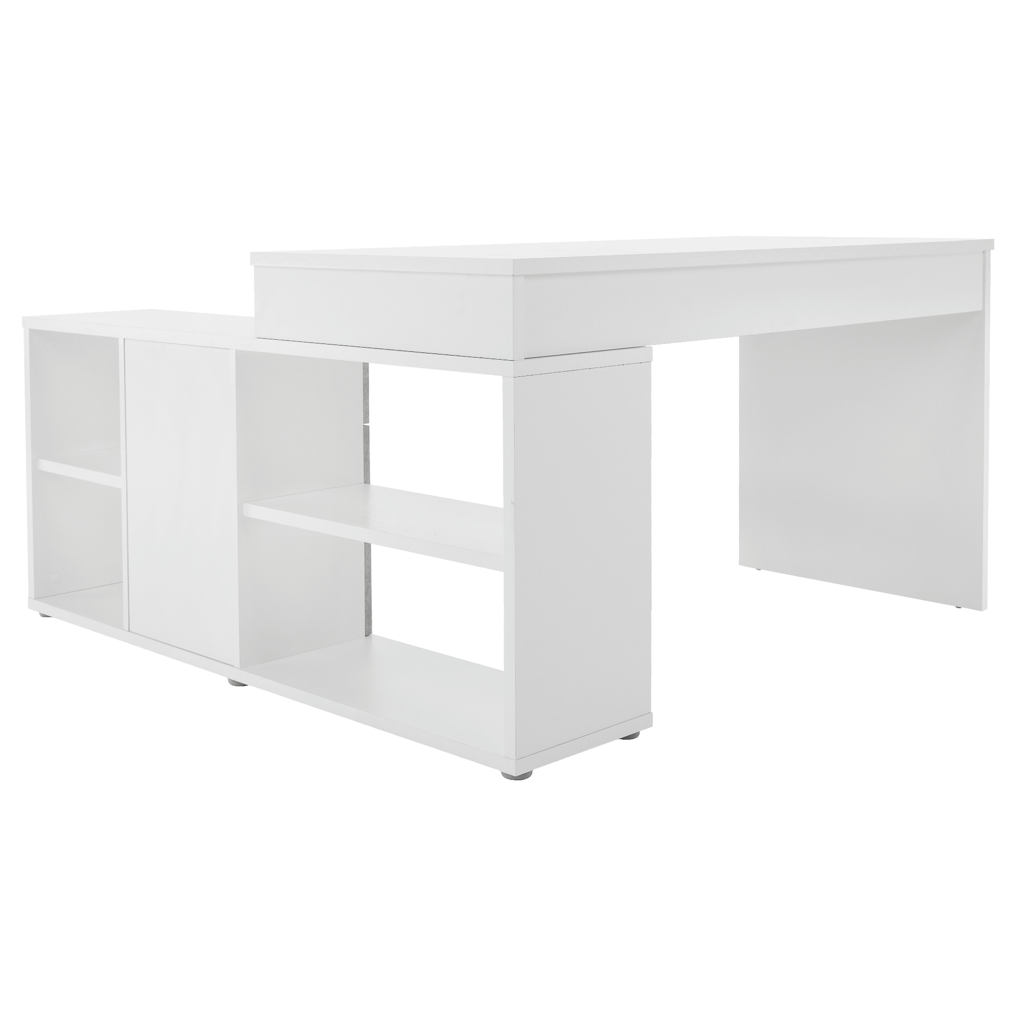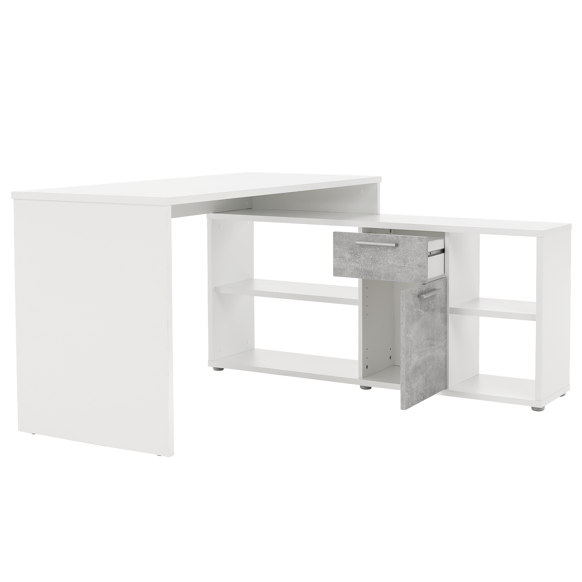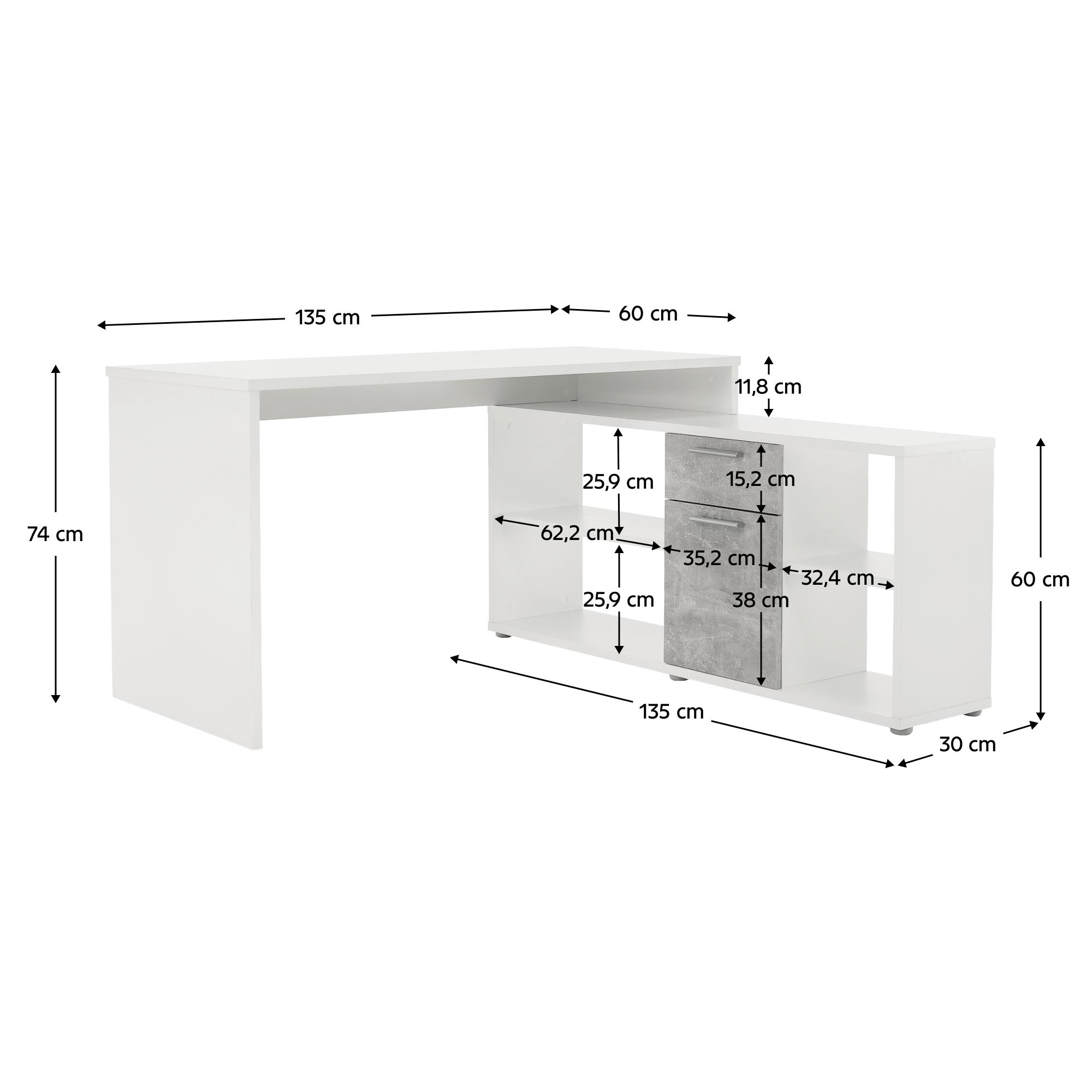 PC stôl rohový, materiál DTD laminovaná. Prevedenie: biela/betón. Rozmery ŠxGxV: 135x135x74 cm. Hrúbka materiálu: 16/22 mm