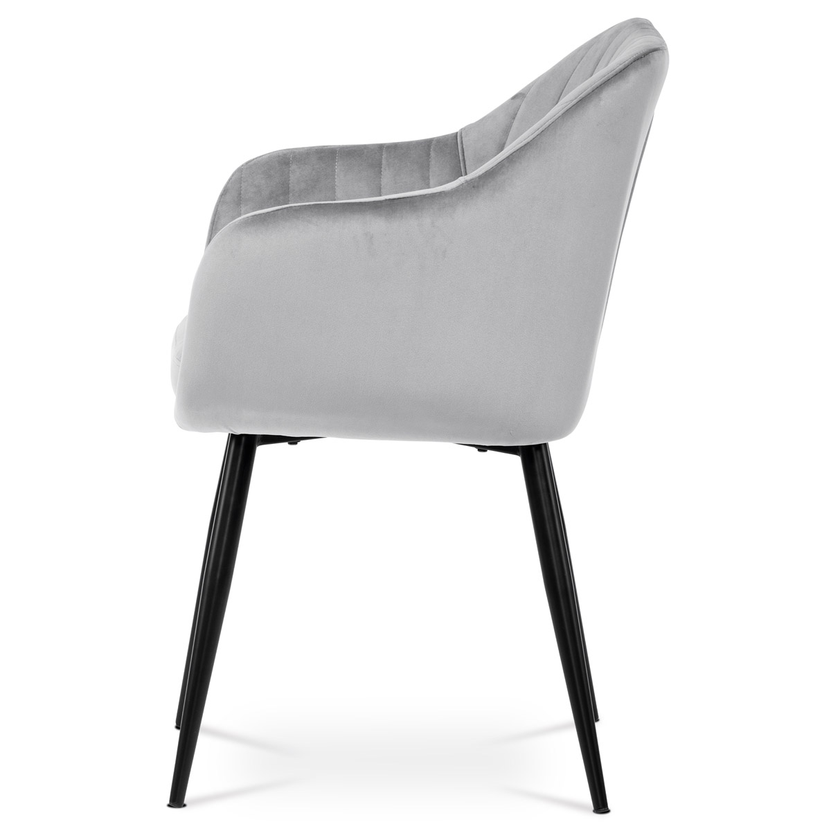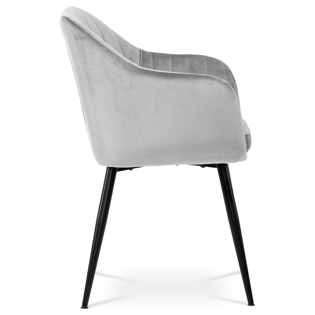 Dokonalý dizajn, industriálny štýl a perfektné pohodlie je pre túto stoličku samozrejmosťou. Škrupina sedadla i operadla má pevnú kovovú kostru, poťah z veľmi kvalitnej zamatovej látky v matnom prevedení v trendy odtieni striebornej. Polstrovanie je z PU peny. Bonusom na zvýšenie pohodlia posedu je 8 cm zvýšený a extra polstrovaný sedák a praktické pohodlné opierky s opornou plochou vo výške 69 cm od podlahy. Príjemný dekoratívny prvok vytvárajú zvislé prešitie vnútorných častí operadla aj bokov. Použitá látka je veľmi odolná a perfektne sa čistí. Stabilitu stoličky zaisťujú štyri kónické kovové nohy s kvalitným práškovým nástrekom v čiernej matnej farbe. Ukončené sú čiernymi plastovými klzákmi, zabraňujúci poškodeniu tvrdých povrchov podláh. Nohy majú kruhový prierez s priemerom od 2 do 3,5 cm v hornej časti. Všetky tieto plus produkujú z tohto modelu skvelú voľbu pre Váš výber zariadení jedálenských alebo obývacích priestorov, ale skvele sa hodia aj ako konferenčné stoličky do zasadacích miestností. Nosnosť stoličky je až 120 kg. Základné rozmery sú - celková šírka 58 cm, celková hĺbka 57 cm, celková výška 84 cm, výška sedu 52 cm a hĺbka sedu 43 cm.