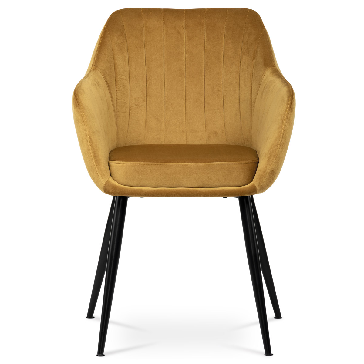 Dokonalý dizajn, industriálny štýl a perfektné pohodlie je pre túto stoličku samozrejmosťou. Škrupina sedadla i operadla má pevnú kovovú kostru, poťah z veľmi kvalitnej zamatovej látky v matnom prevedení a vo veľmi žiadanom odtieni horčicovo žltej. Polstrovanie je z PU peny. Bonusom na zvýšenie pohodlia posedu je 8 cm zvýšený a extra polstrovaný sedák a praktické pohodlné opierky s opornou plochou vo výške 69 cm od podlahy. Príjemný dekoratívny prvok vytvárajú zvislé prešitie vnútorných častí operadla aj bokov. Použitá látka je veľmi odolná a perfektne sa čistí. Stabilitu stoličky zaisťujú štyri kónické kovové nohy s kvalitným práškovým nástrekom v čiernej matnej farbe. Ukončené sú čiernymi plastovými klzákmi, zabraňujúci poškodeniu tvrdých povrchov podláh. Nohy majú kruhový prierez s priemerom od 2 do 3,5 cm v hornej časti. Všetky tieto plus produkujú z tohto modelu skvelú voľbu pre Váš výber zariadení jedálenských alebo obývacích priestorov, ale skvele sa hodia aj ako konferenčné stoličky do zasadacích miestností. Nosnosť stoličky je až 120 kg. Základné rozmery sú - celková šírka 58 cm, celková hĺbka 57 cm, celková výška 84 cm, výška sedu 52 cm a hĺbka sedu 43 cm.