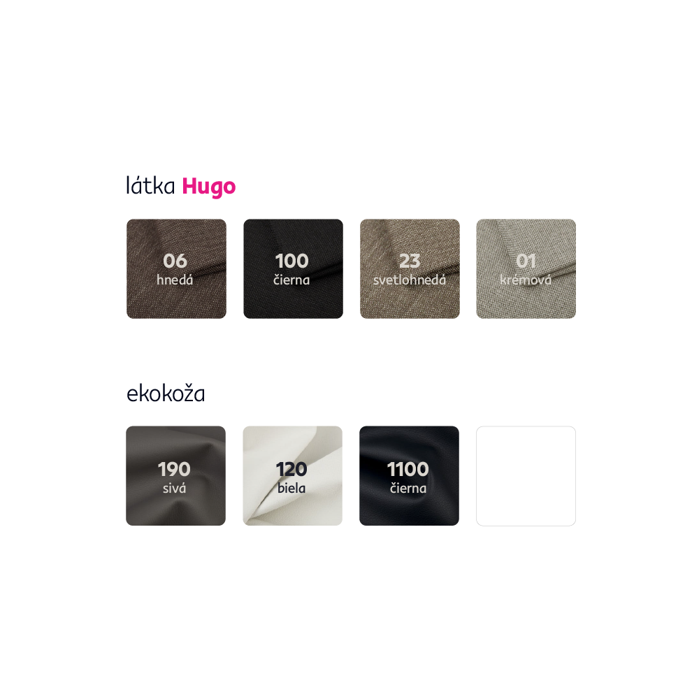 Možnosť objednania v 4 farebných prevedeniach látky Hugo v kombinácií s 3 farebnými prevedeniami ekokože v cene 599 Eur. Pri individuálnej objednávke je potrebné zaplatiť 20% zálohu z danej sumy. Po uhradení zálohy bude Vaša požiadavka zadaná do výroby. Dodacia lehota 6-8 týždňov.