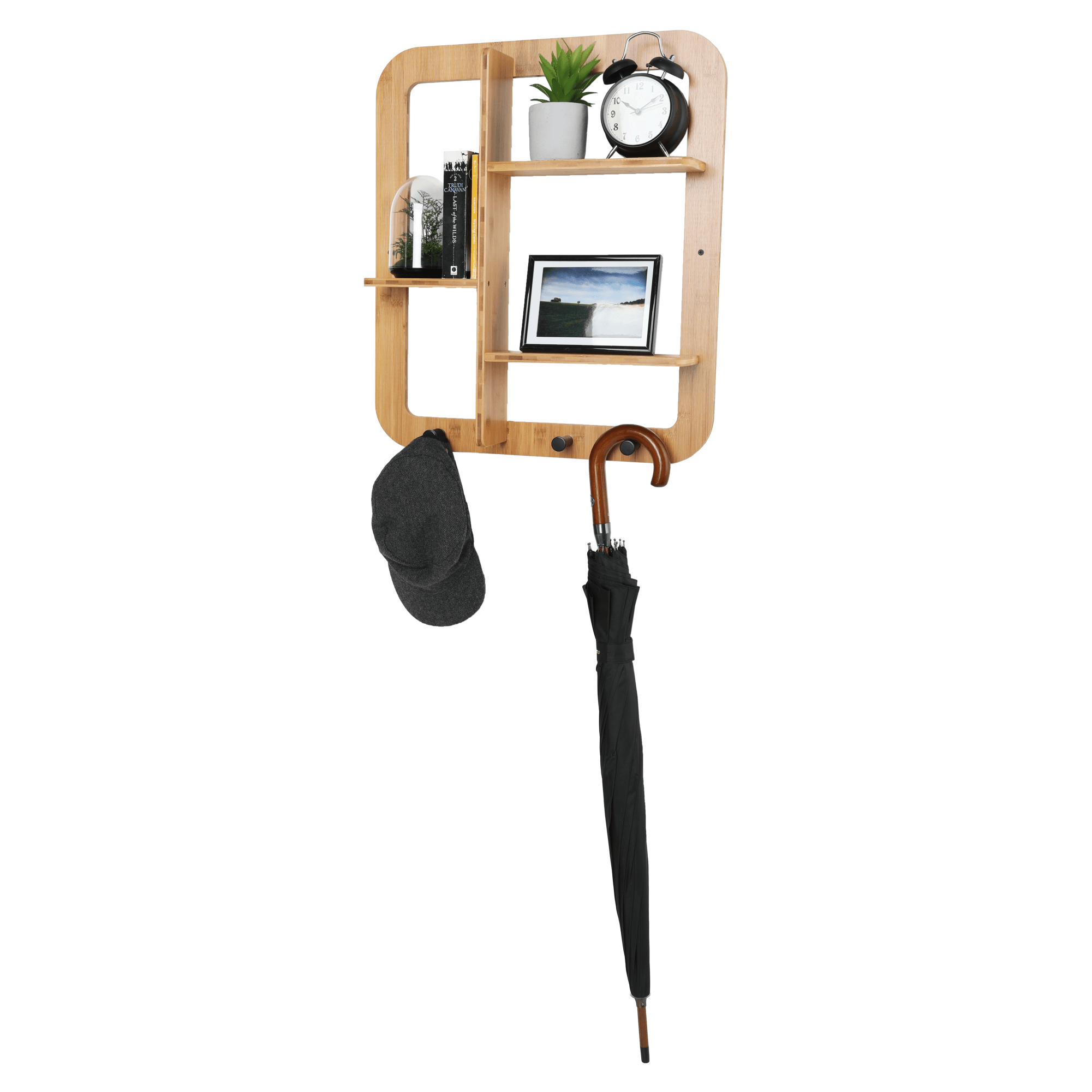Materiál: bambus lakovaný Farba: prírodná Rozmery (ŠxHxV): 52x10x59,5 cm Tvar štvorca Štyri háčiky Tri poličky Nosnosť: 10 kg