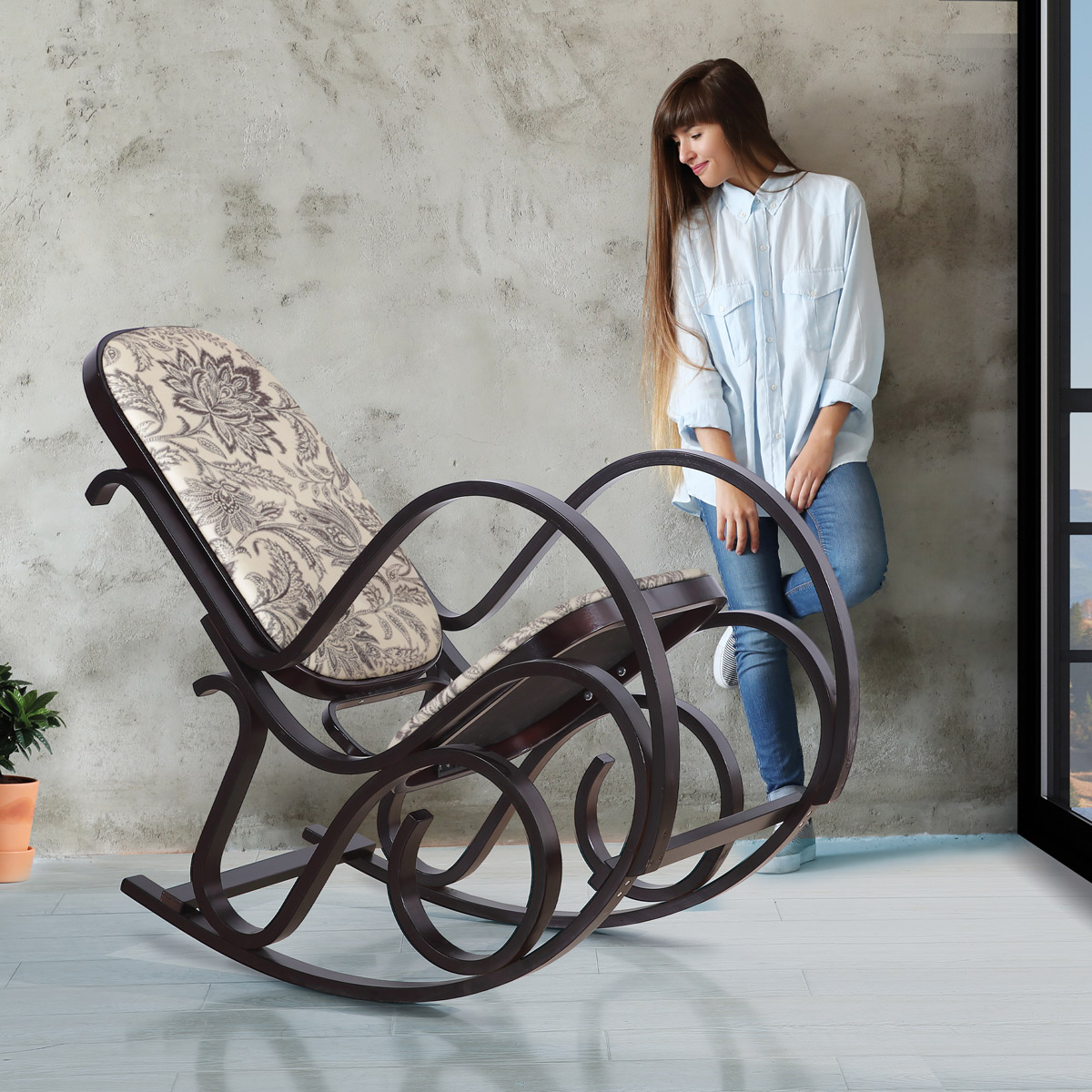 Klasické a nadčasové hojdacie kreslo, ktorého design nás sprevádza už niekoľko generácií. Je priamo stelesnením pohody a relaxácie. Zapadne do akokoľvek štýlovo zariadeného interiéru, v každom pôsobí ako skvelý solitér. Prečítajte si v jeho pohodlí knižku, hrajte hry či on-line komunikujte alebo sa len nechajte uspávať pri jeho ľahkom hojdaní. Kreslo je vyrobené z ohýbanej bukovej preglejky, morenej na odtieň tmavý orech a lakované transparentným lakom. Poťah sedadla aj operadla je z krémovej hladkej látky s výrazným hnedým rastlinným motívom, polstrovanie je z PU peny. Nosnosť je 110 kg.