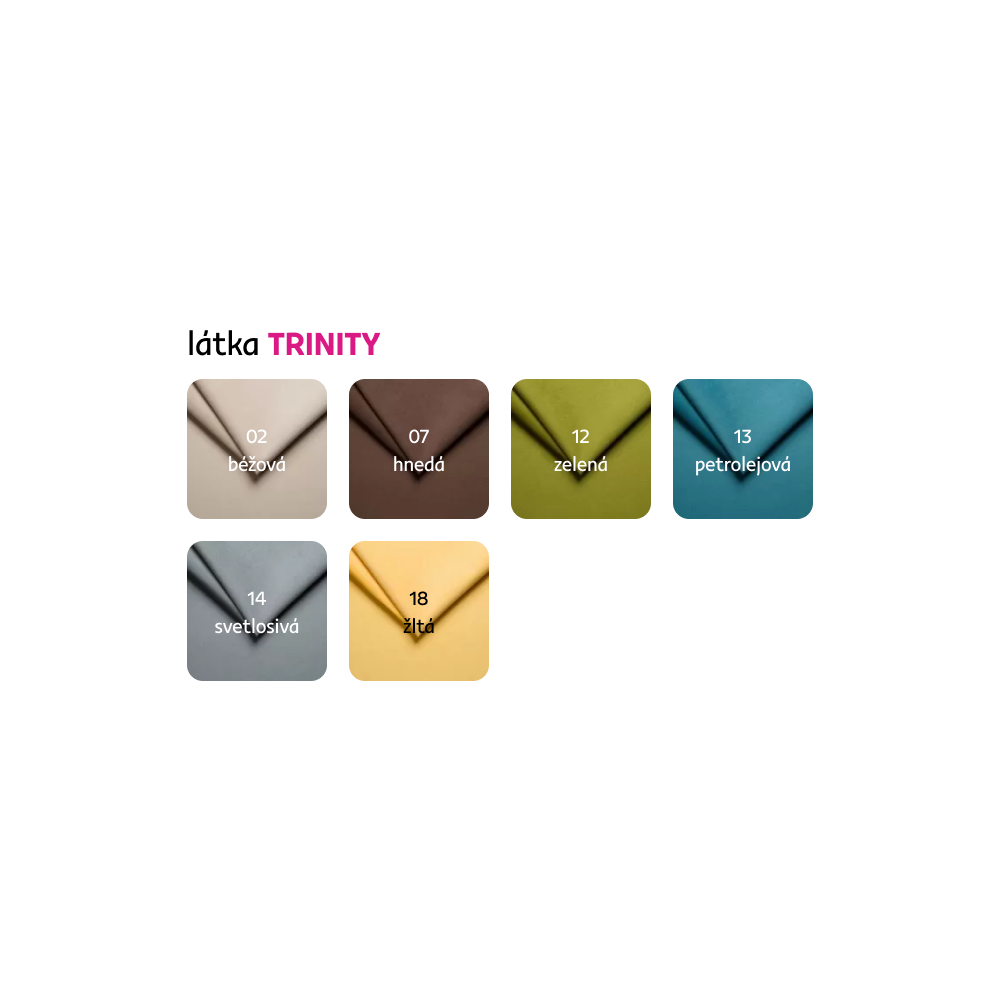 Možnosť objednania v 6 farebných odtieňoch látky Trinity v cene 425 Eur s dodacou lehotou 6-8 týždňov. Pri individuálnej objednávke je potrebné zaplatiť 20% zálohu z danej sumy. Po uhradení zálohy bude Vaša požiadavka zadaná do výroby.