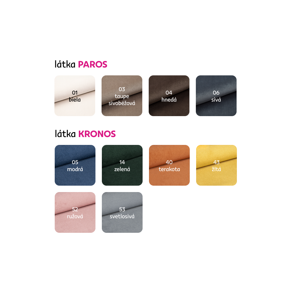 Možnosť objednania v 4 farebných prevedeniach látky Paros a v 6 farebných prevedeniach látky Kronos cene 629 Eur s dodacou lehotou 6-8 týždňov. Pri individuálnej objednávke je potrebné zaplatiť 20% zálohu z danej sumy. Po uhradení zálohy bude Vaša požiadavka zadaná do výroby.