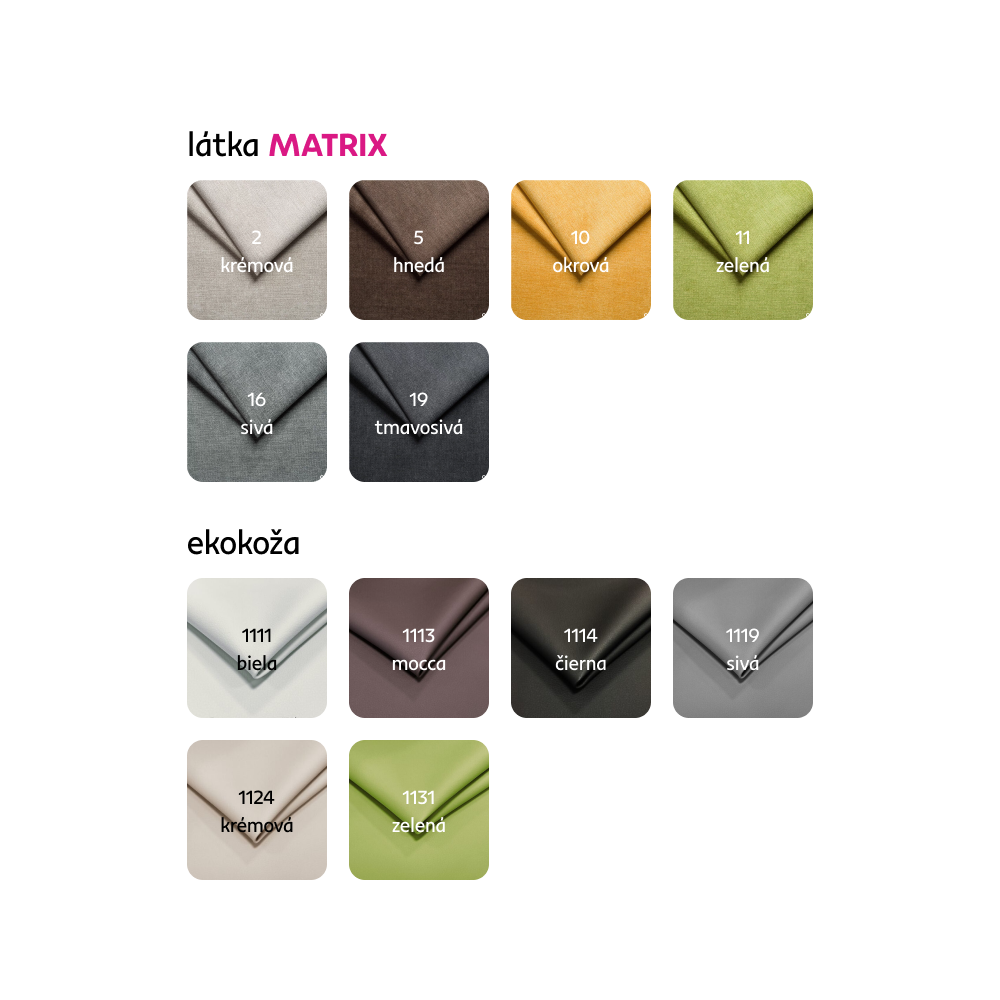 Možnosť objednania v 6 farebných prevedeniach látky Matrix a v 6 prevedeniach ekokože roh U veľký v cene 1.549 Eur, kreslo - 365 Eur, taburet - 125 Eur. Pri individuálnej objednávke je potrebné zaplatiť 20% zálohu z danej sumy. Po uhradení zálohy bude Vaša požiadavka zadaná do výroby. Doba dodania 6-8 týždňov. Váš výber poznačte do poznámky v objednávke.