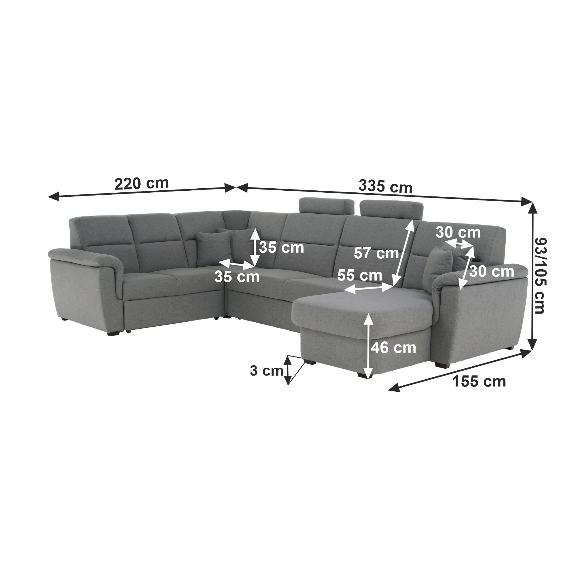 Rozmery (ŠxHxV): 335x220/155x93/105 cm, plocha na spanie (ŠxD): 125x270 cm