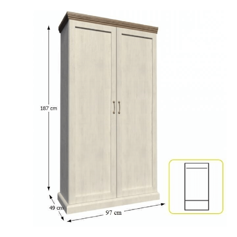 Vešiaková skriňa S2D s jednou policou z elegantného sektorového systému Royal v provensálskom štýle. Vhodná na zariadenie obývacích izieb či spální. Materiál: korpus DTD laminovaná + ozdobné lišty, kovové úchytky Farebné prevedenie: sosna nordická/dub divoký Rozmery ŠxHxV: 97x49x187 cm Hrúbka materiálu korpus: 15 mm Hrúbka materiálu vrchnej dosky: 22 mm Dodávané v demonte.