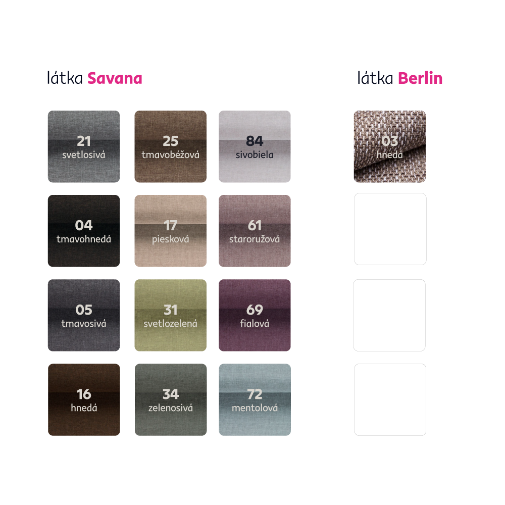 Možnosť individuálnych objednávok v odtieni Berlin 03 a 12 odtieňoch látky Savana. Pri individuálnej objednávke je potrebné zaplatiť 20% zálohu z danej sumy. Po uhradení zálohy bude Vaša požiadavka zadaná do výroby. Dodacia lehota 6-8 týždňov.