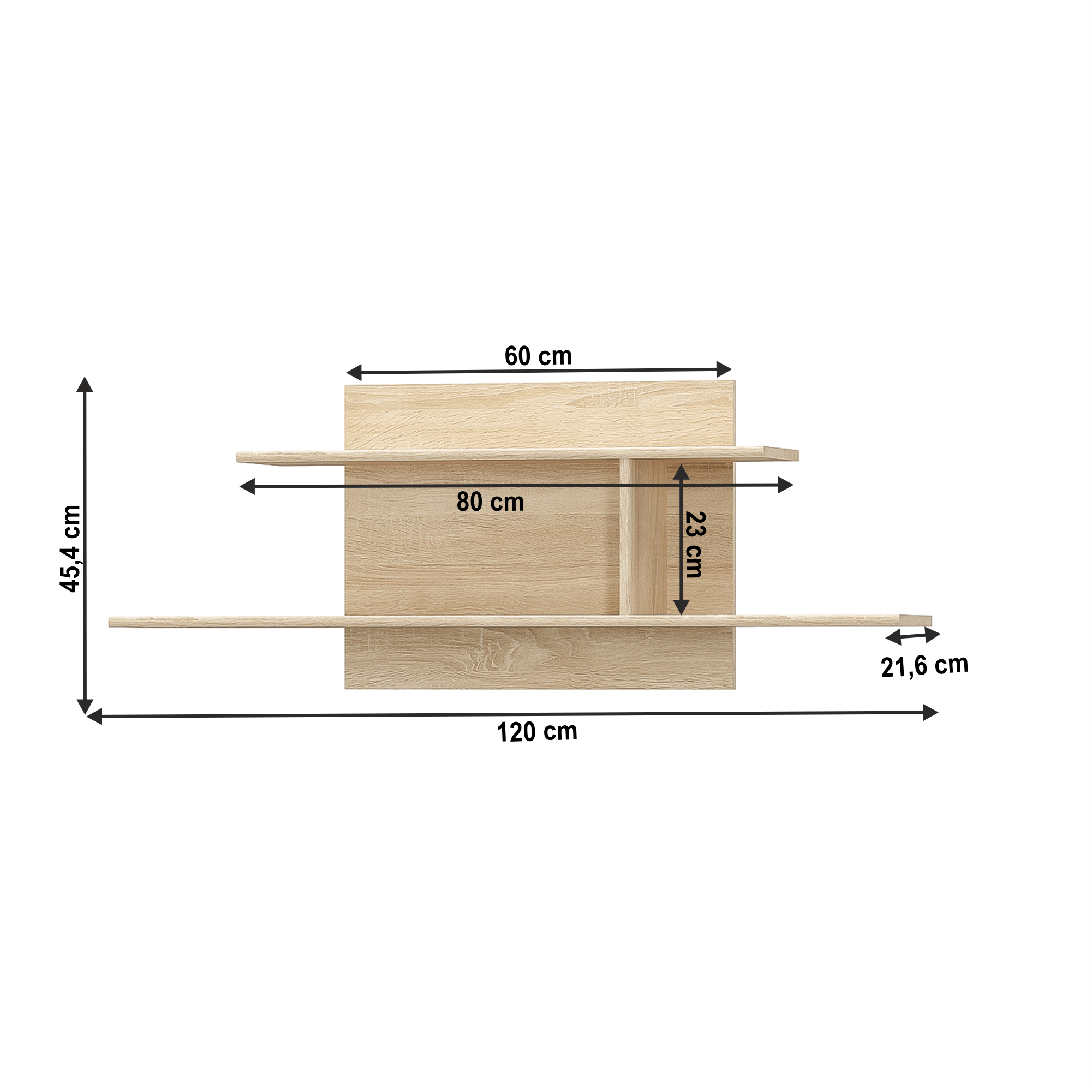 Visiaca polica 120 TEYO Materiál: DTD laminovaná Farba: dub sonoma Rozmery (ŠxHxV): 120x21,6x45,4 cm Hrúbka materiálu: 16 mm Dodávané v demonte.