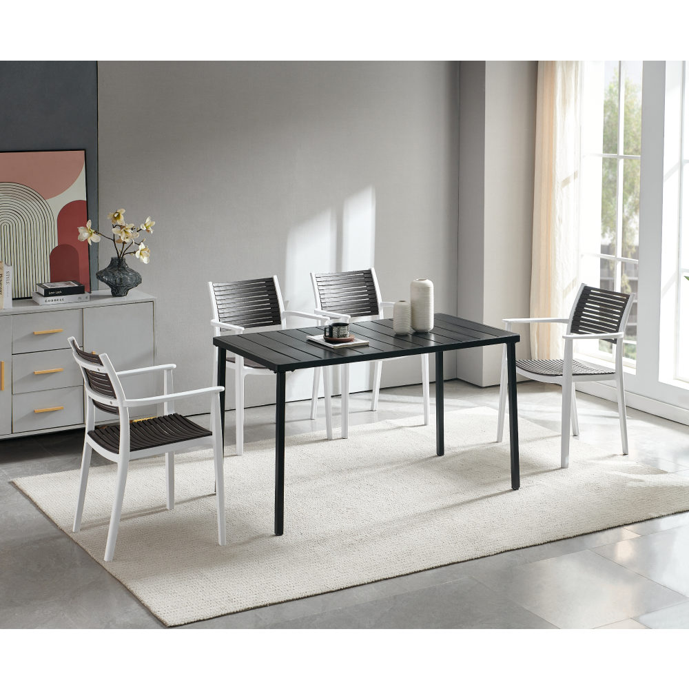 Materiál: kov Farba: čierna Rozmery (ŠxHxV): 130x70x75 cm Nosnosť: 70 kg Hmotnosť: 14 kg Jednoduchý Praktický Na nožičkách Jedálenský/záhradný stôl Vhodný do interiéru aj exteriéru Stolovanie pre 4-6 ľudí Dodávané v demonte